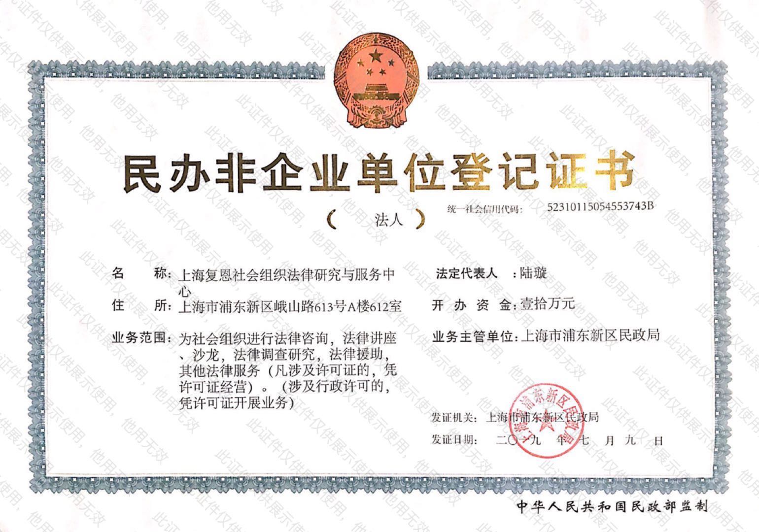 复恩民办非企业单位登记证书